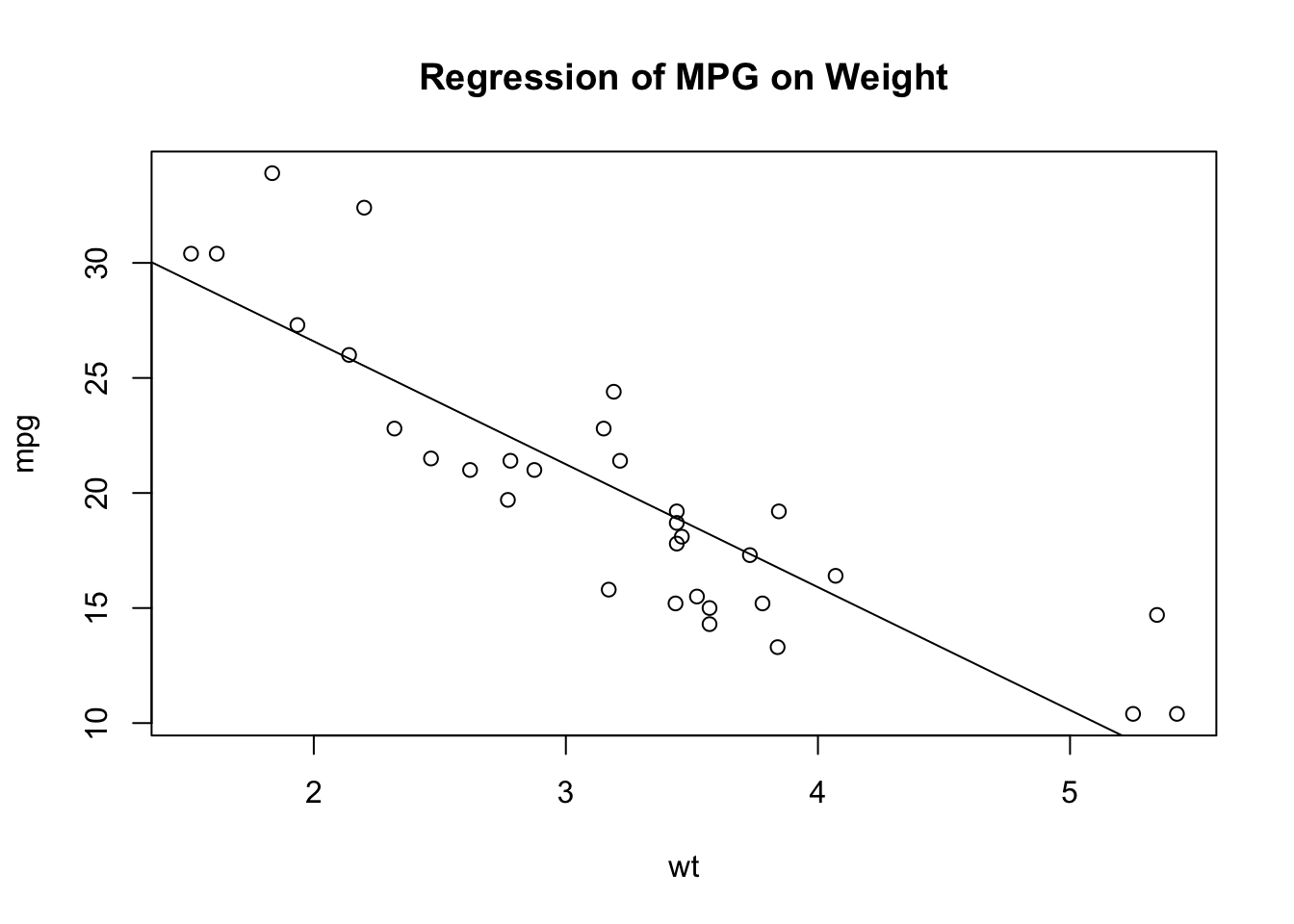 plot(mtcars$wt, mtcars$mpg, main="Scatterplot of wt vs. mpg")