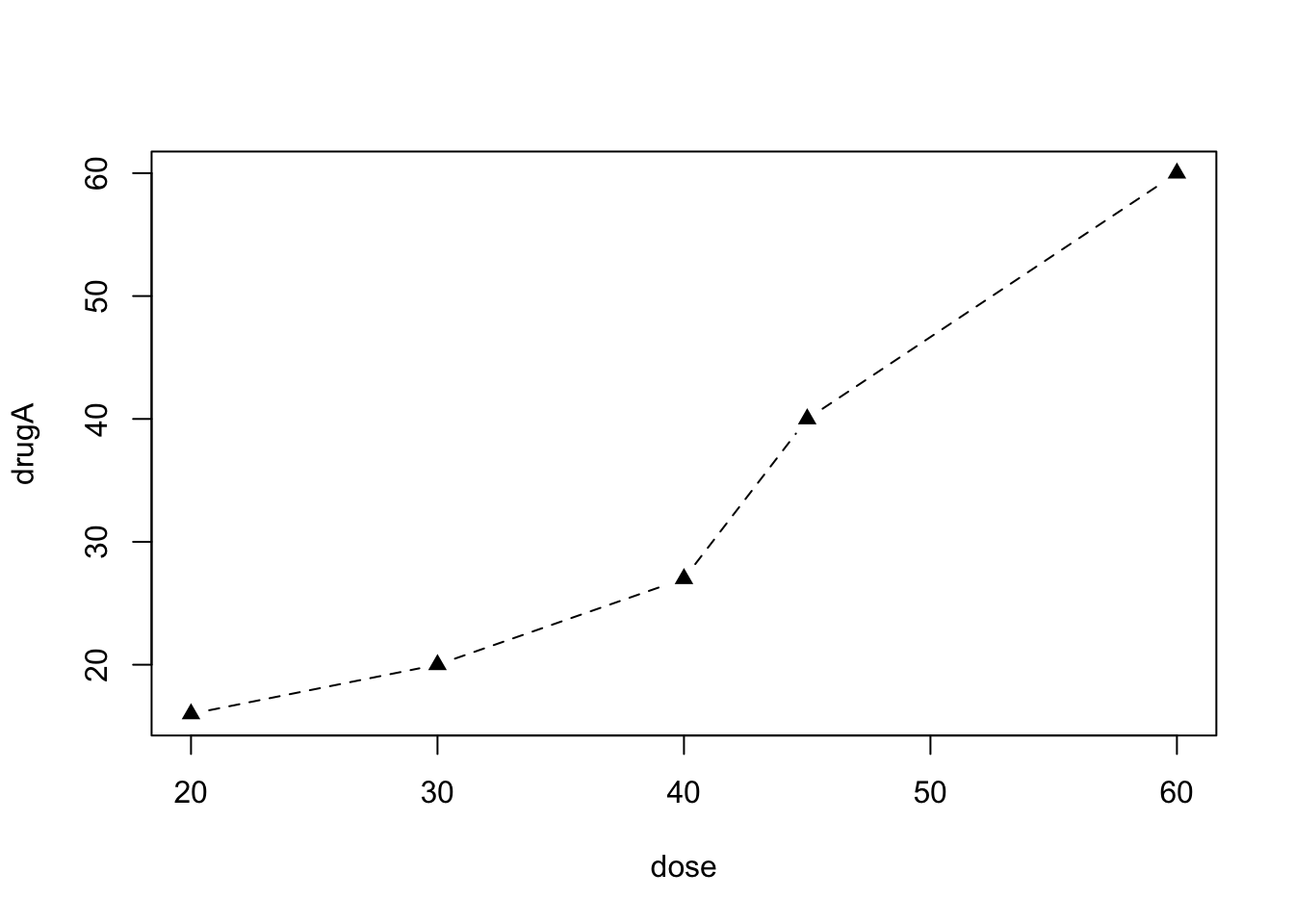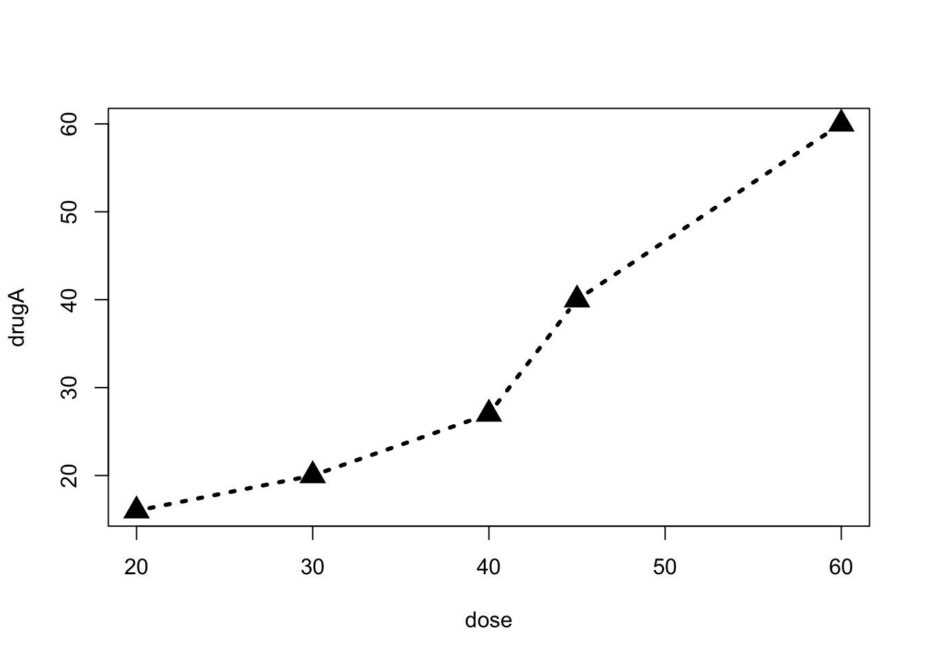 plot(dose, drugA, type="b", lty=3, lwd=3, pch=17, cex=2)