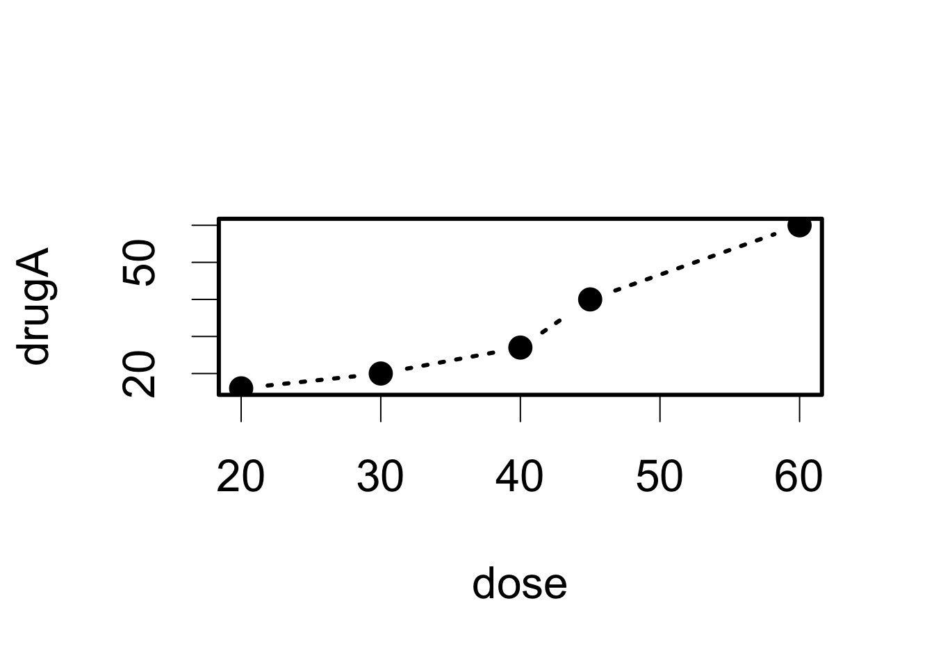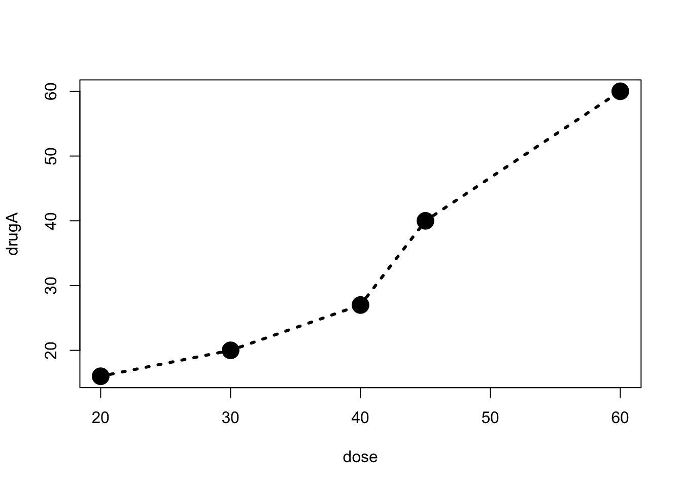 plot(dose, drugA, type="b", pch = 19, cex=2, lty=3, lwd=3)