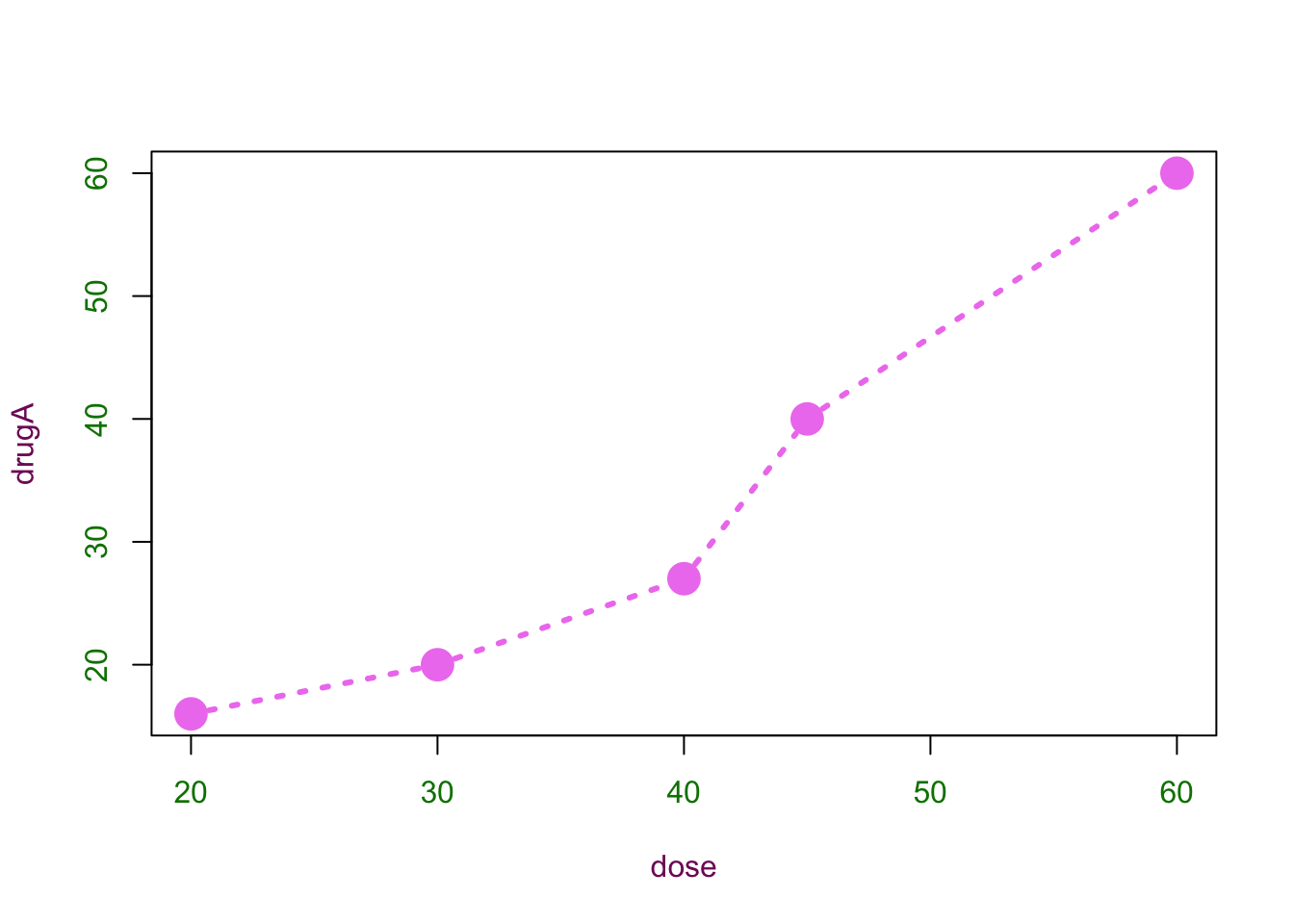 plot(dose, drugA, type="b", pch = 19, cex=2, lty=3, lwd=3, col="violet", col.axis="#008000", col.lab=rgb(.5,.1,.4))