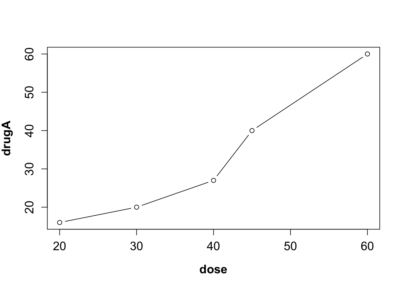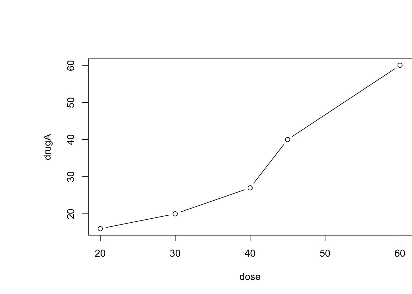drugB <- c(15, 18, 25, 31, 40)A simple line graph relating dose to response for drug A can be created using