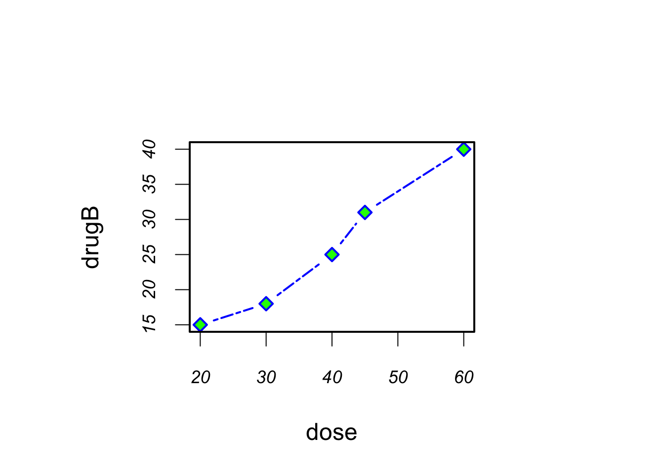 plot(dose, drugB, type="b", pch=23, lty=6, col="blue", bg="green")