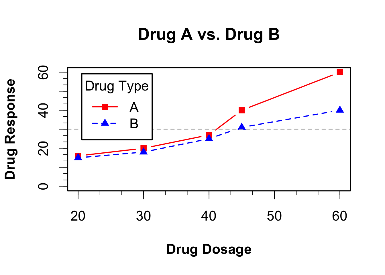 legend("topleft", inset=.05, title="Drug Type", c("A","B"), lty=c(1, 2), pch=c(15, 17), col=c("red", "blue"))