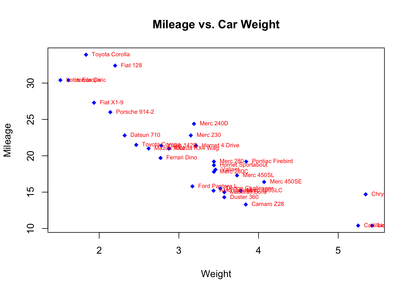 This example plots car mileage versus car weight for the 32 automobile makes provided in the mtcars data frame. The text() function is used to add the car make to the right of each data point. The point labels are shrunk by 40% and presented in red.