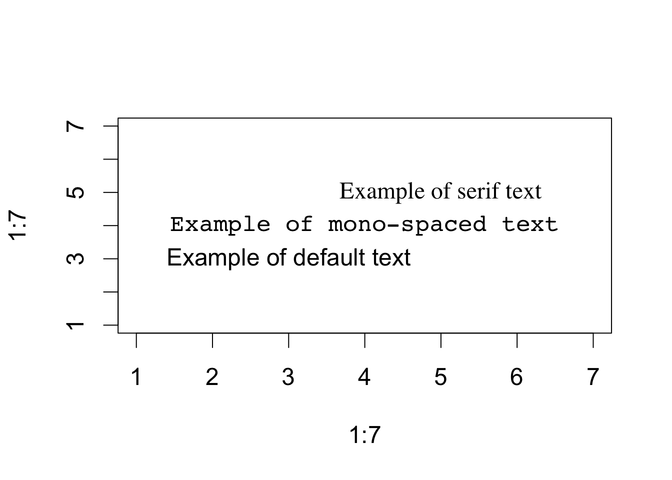 par(opar) The resulting plot will differ from platform to platform, because plain, mono, and serif text are mapped to different font families on different systems.