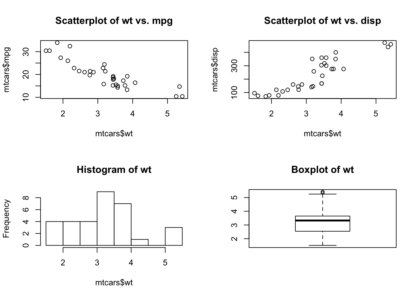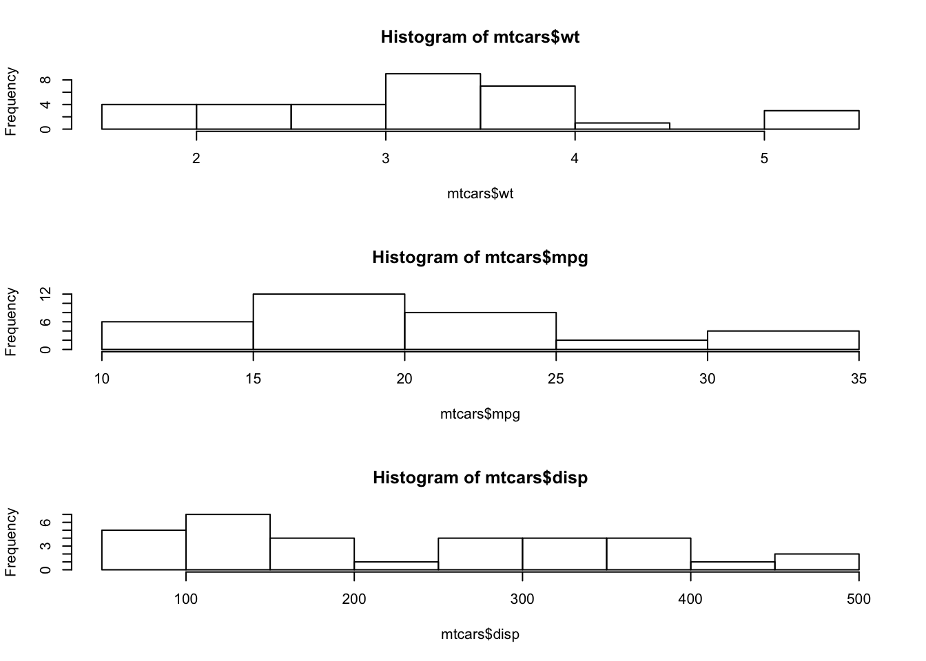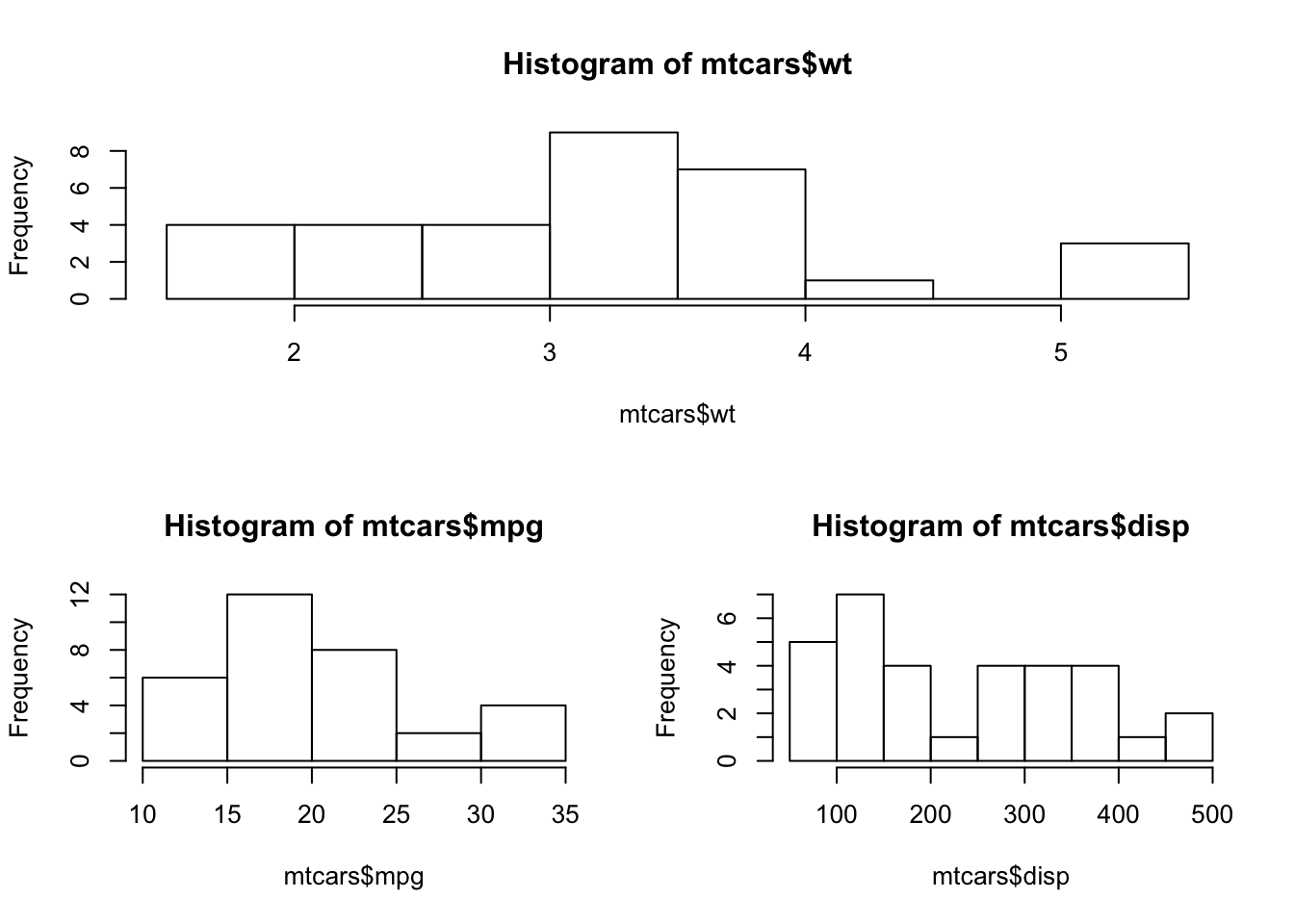 hist(mtcars$disp)As you can see, layout() gives you easy control over both the number and place- ment of graphs in a final image and the relative sizes of these graphs. See help(layout) for more details.