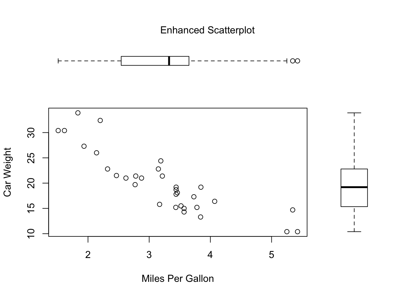 mtext("Enhanced Scatterplot", side=3, outer=TRUE, line=-3)
