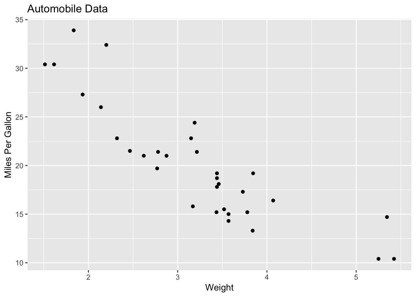 labs(title="Automobile Data", x="Weight", y="Miles Per Gallon")