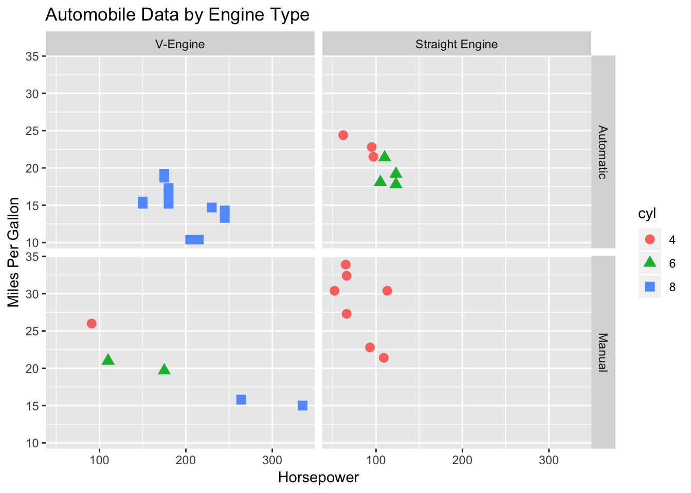 The resulting graph contains separate scatterplots for each combination of transmission type (automatic vs. manual) and engine arrangement (V-engine vs. straight engine). The color and shape of each point indicates the number of engine cylinders in that car.