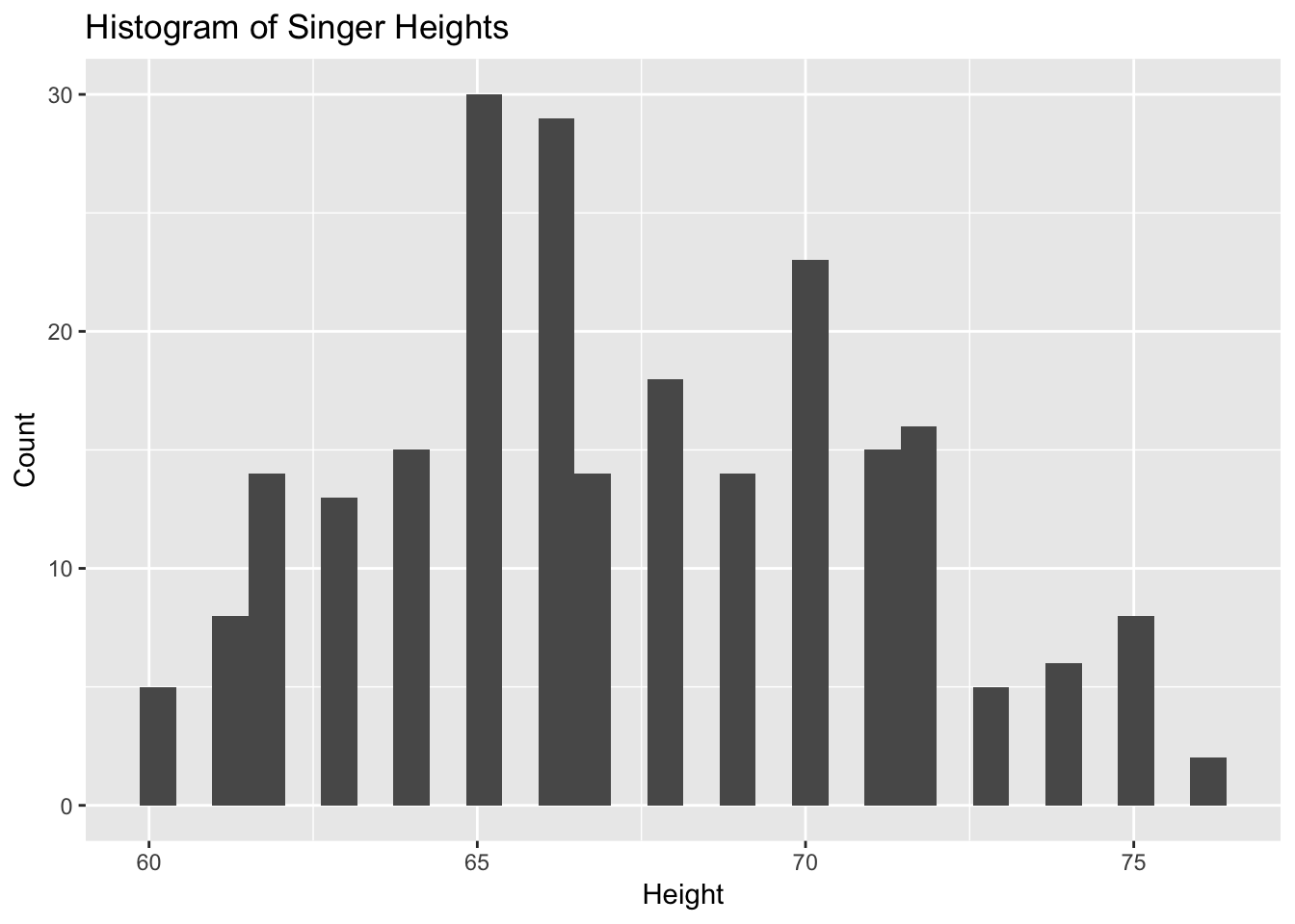 x="Height", y="Count")## `stat_bin()` using `bins = 30`. Pick better value with `binwidth`.