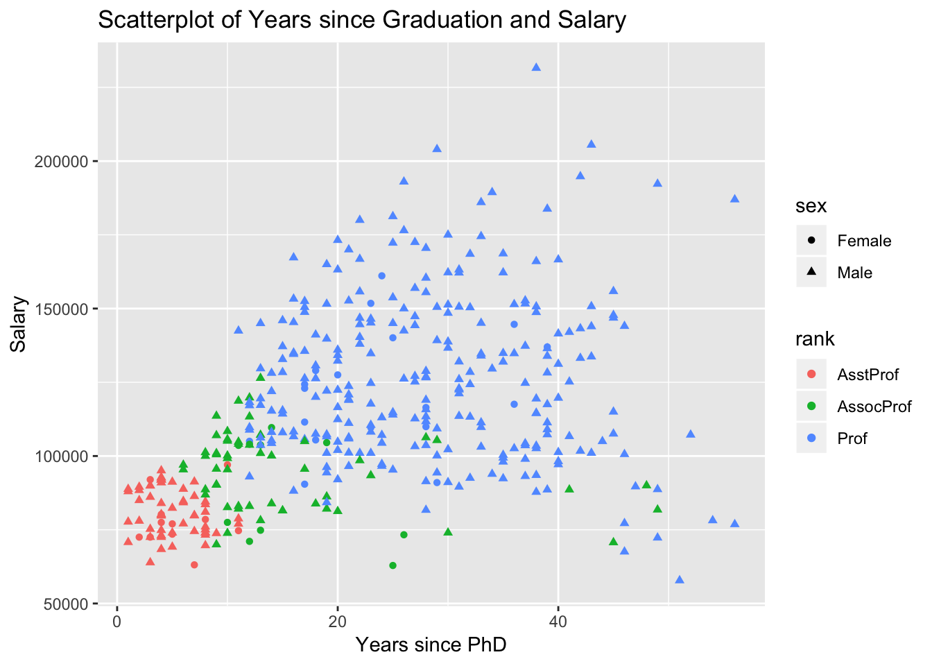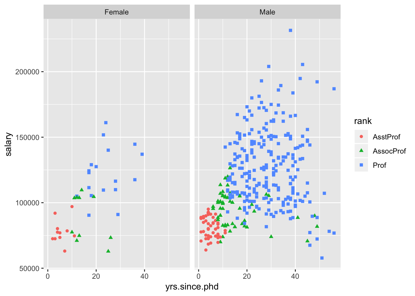 labs(title="Salary by Rank and Sex", x="Rank", y="Salary") +