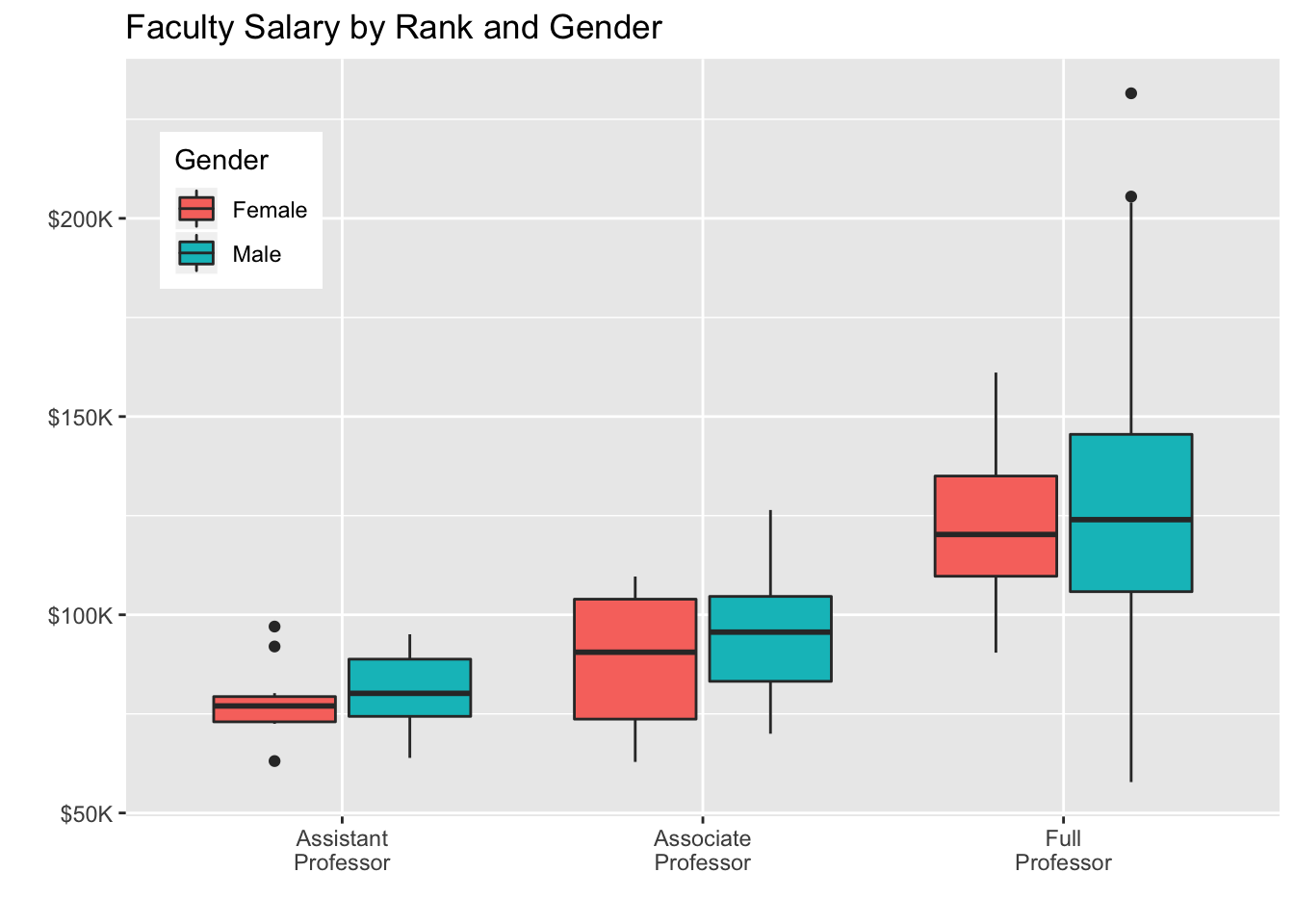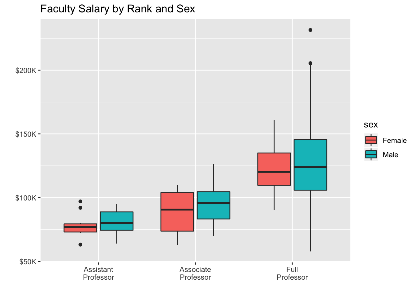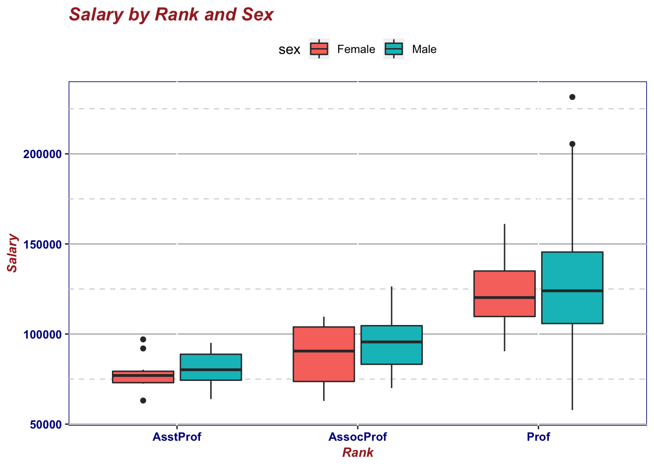 Let’s apply these functions to a graph with grouped box plots for faculty salaries by rank and sex. The code is as follows: