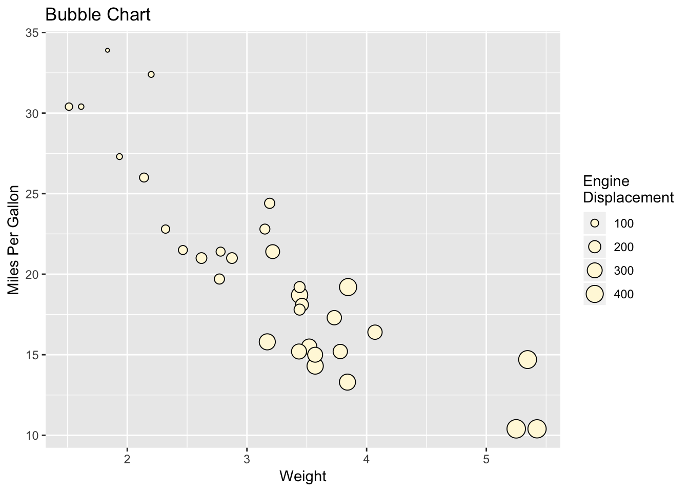 The aes() parameter size=disp generates a scale for the continuous variable disp (engine displacement) and uses it to control the size of the points. The result is the bubble chart presented in the figure above. The graph shows that auto mileage decreases with both weight and engine displacement.