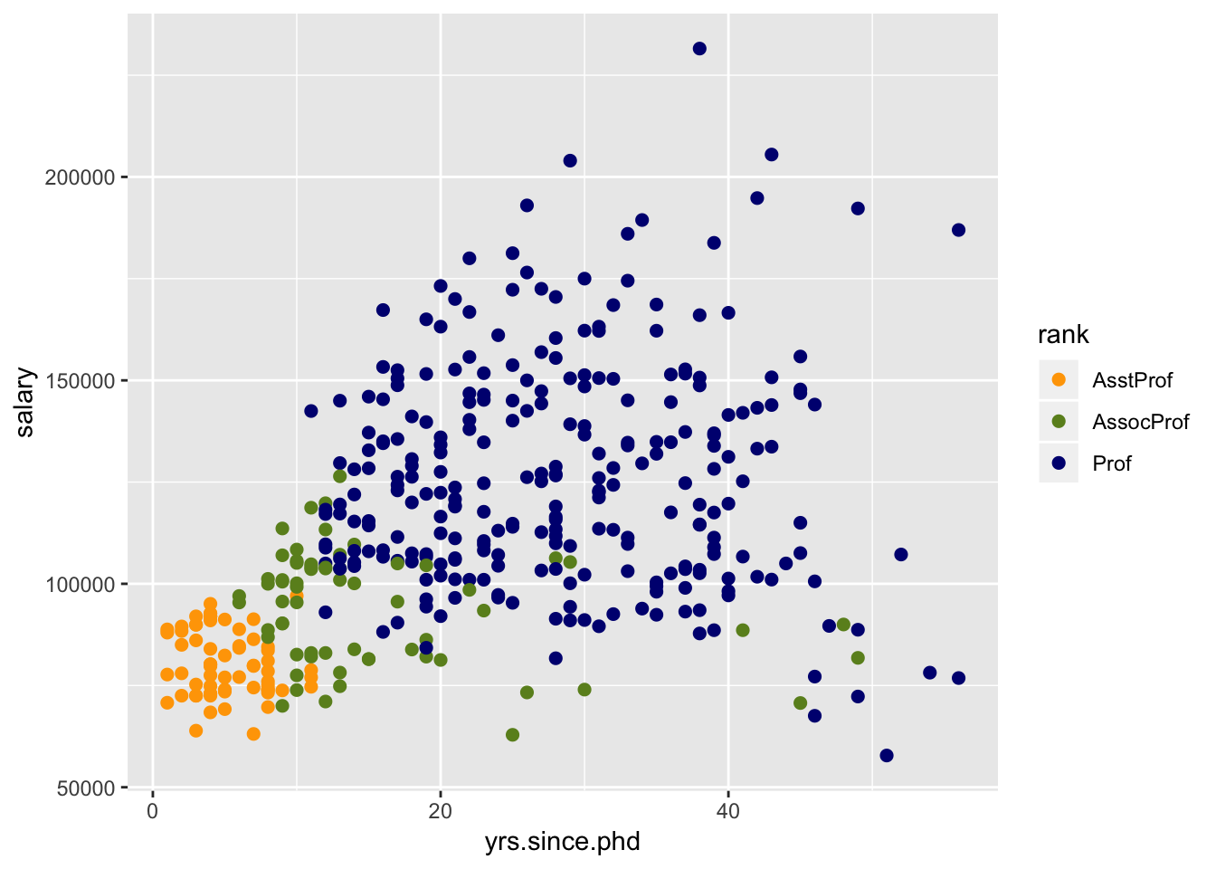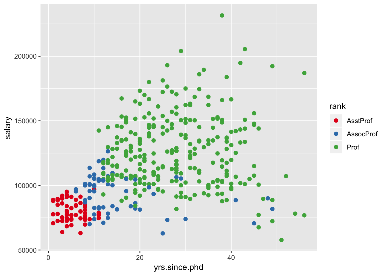uses the scale_color_manual() function to set the point colors for the three aca- demic ranks. The results are displayed in figure 19.19.