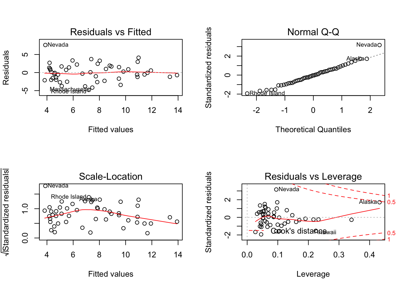 In order to evaluate the statistical assumptions behind the OLS method a standard approach is to apply plot() function to the object created by lm():