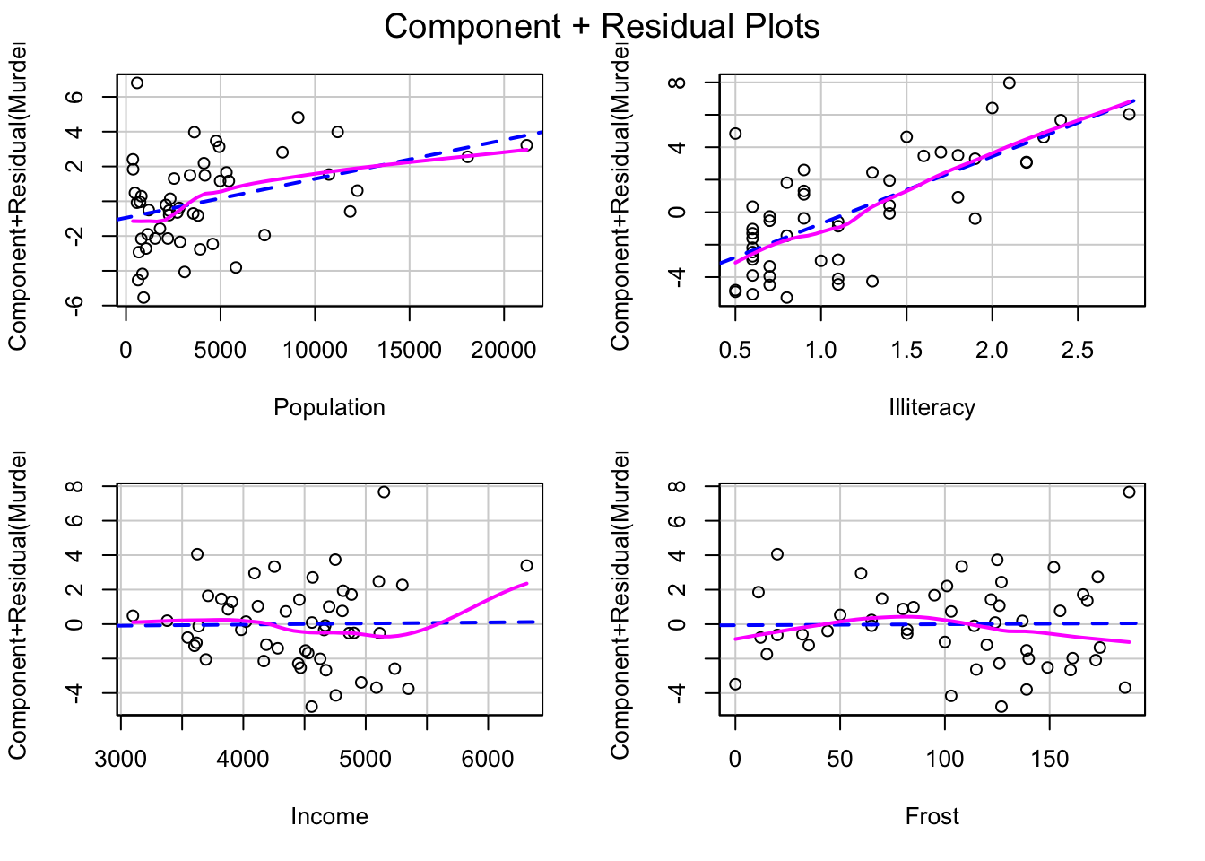 By using component plus residual plots we can check whether there is any systematic departure from the linear specification.This plot is produced by the crPlots() function in the car package: