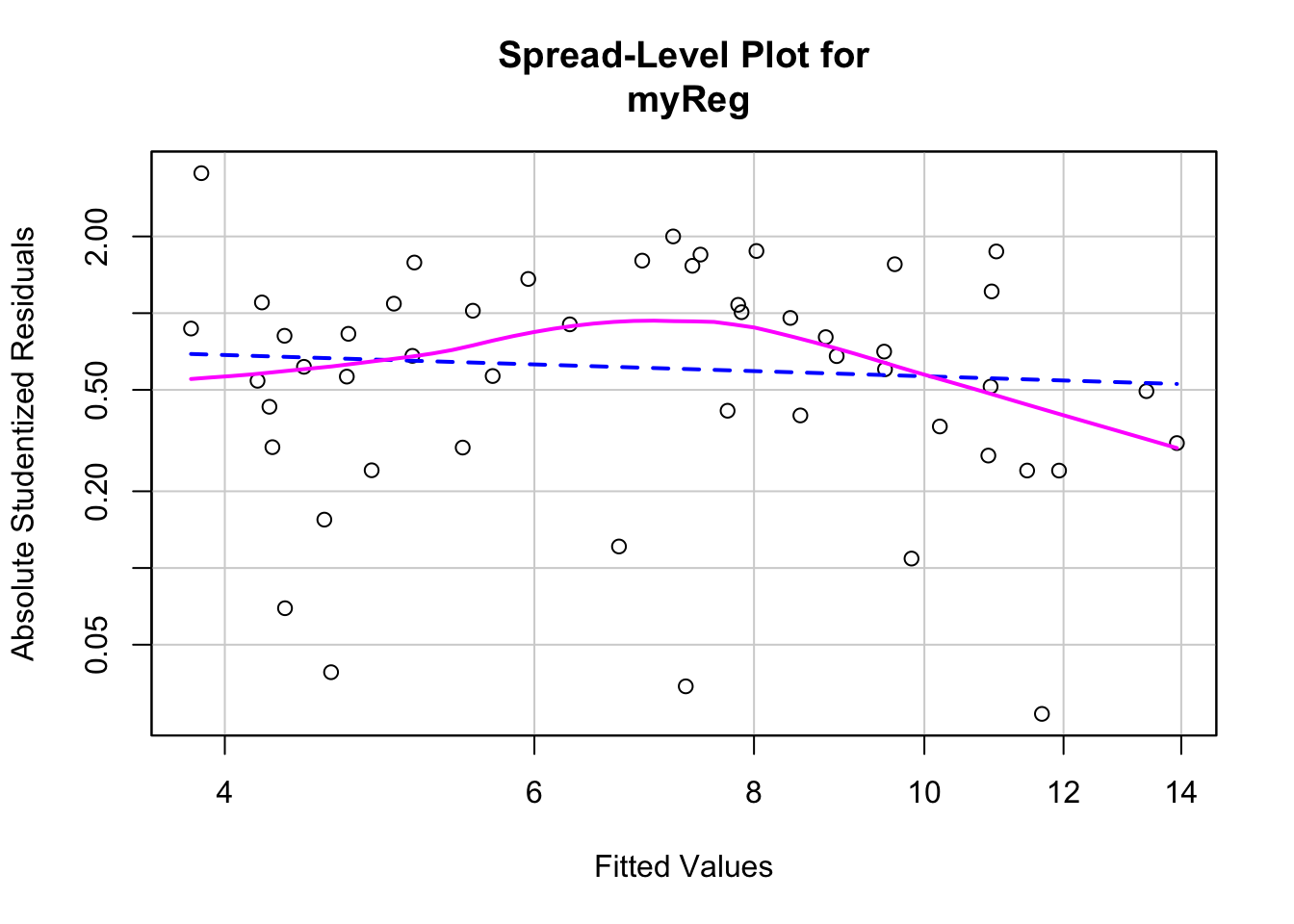 We can also look at the scatter plot of the absolute standardized residuals versus the fitted values and superimposes a line of best fit. This plot is produced by the spreadLevelPlot() function in Car.