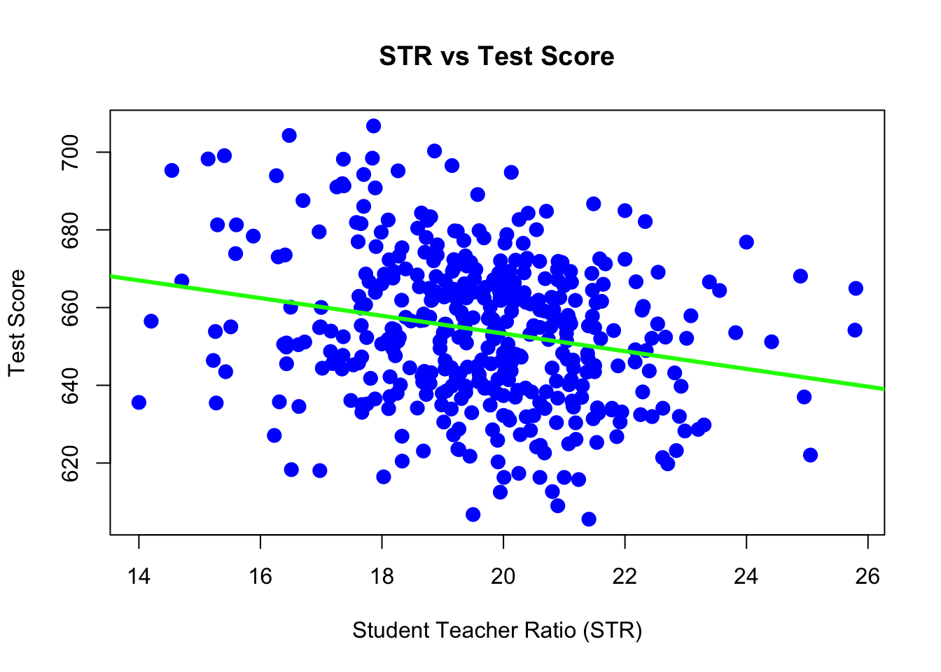 ## [1] 698.932949 -2.279808Therefore, the sample regression line is \[ \widehat{Y} = 698.93 + (-2.28) X. \]